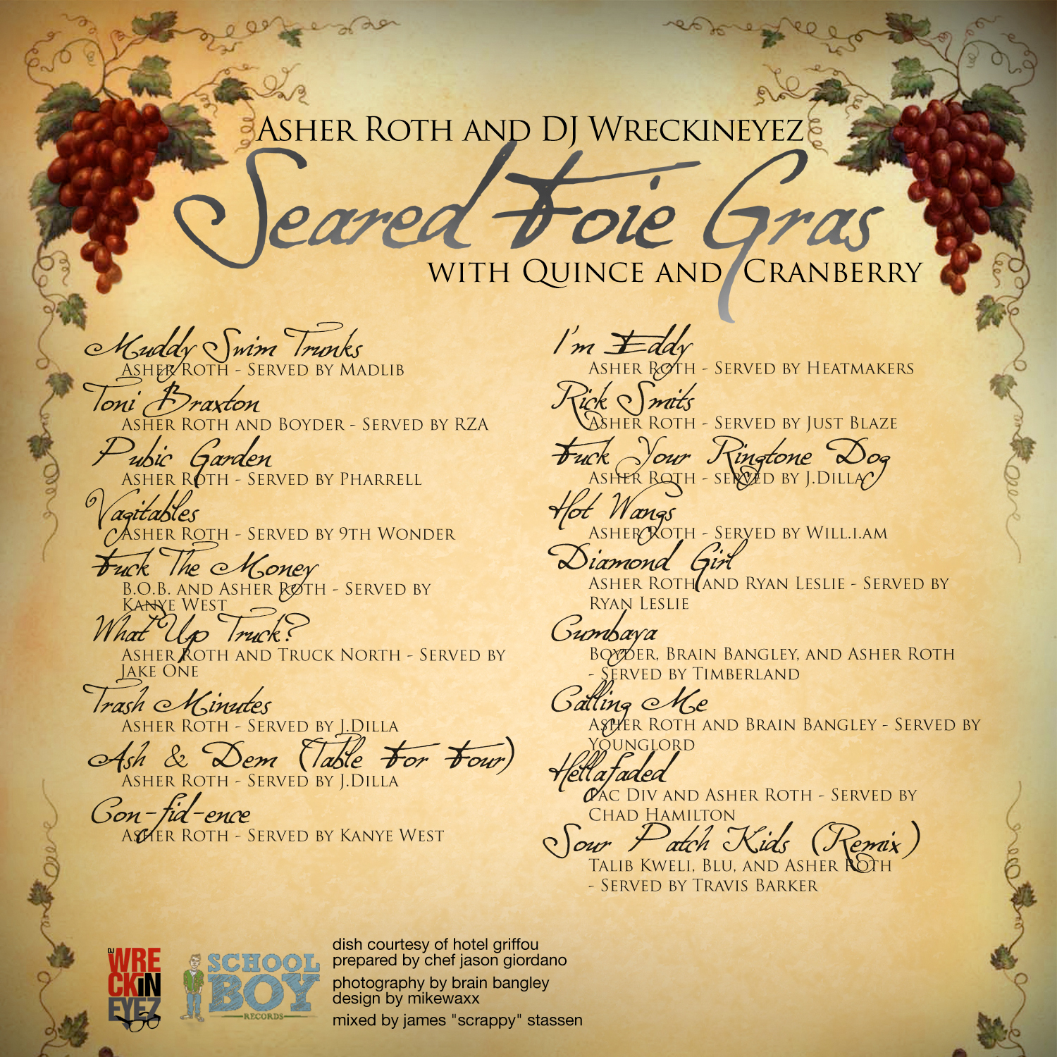 The home boy Asher Roth came to San Francisco recently, for a ‘secret concert’ with N.E.R.D. (which of course I was in attendance for… Shout out to KIN/Microsoft). The concert was amazing, and to say thanks, I wanted to promote Asher’s new mixtape “Seared Foie Gras with Quince and Cranberry”. There is also a new music video for the first track off the mixtape called “Muddy Swim Trunks” Click the pic to watch the video.