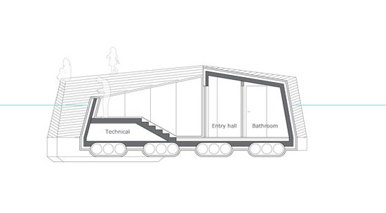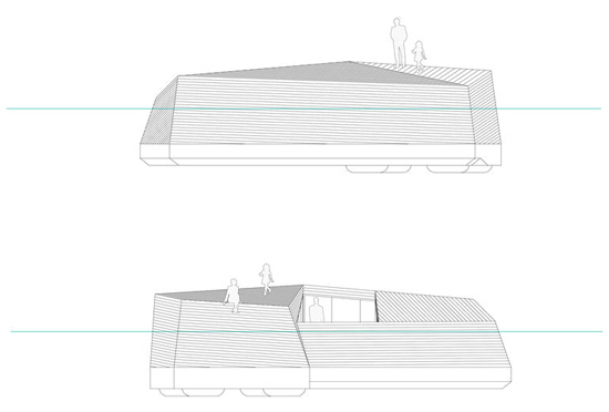 Observing the structure of icebergs, austrian architect Daniel Anderson has created a floating summer cottage design for Alands Hotel. The minimalist exterior is an attempt to remain unintrusive to the wild surroundings. The 60m2 structure is partially submerged in the water with its roof top offering surfaces in which to lie and take in the scenery. Large windows seek to give a spacious feeling to the interior rooms and views of the surrounding panorama. The project is currently in the concept phase.