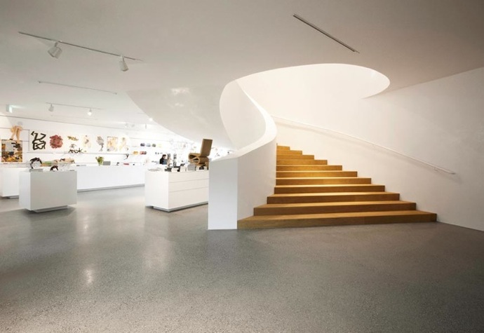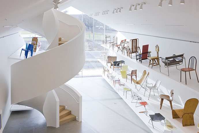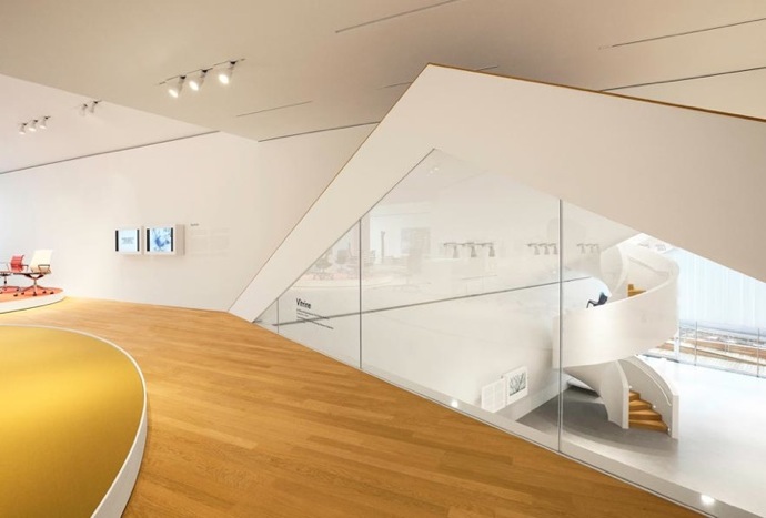 On the interior, magnificent spiral staircases connect the intersecting white-painted interiors. All of the staircases are integrated into expansive, winding organic volumes that figuratively eat their way through the various levels of the building like a worm, sometimes revealing fascinating visual relationships between the various houses, at other times blocking the view. The VitraHaus project joins existing buildings on the Vitra campus by Frank Gehry and Tadao Ando.