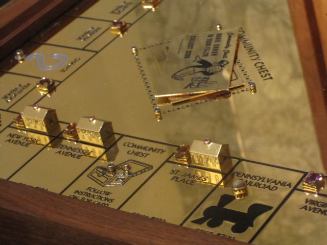 A Monopoly board game made out of solid gold and encrusted with jewels is currently on display at The Museum of American Finance in New York City, and NO, Diddy doesn’t own it… yet. The gold-bound game was created by jeweler Sidney Mobell, who started in 1988 and worked every day for a year on creating the Monopoly game. The board is made in 23 carat gold plate, and all the little houses and hotels are 18 carat solid gold. On the chimneys of houses are genuine rubies, on the chimneys of the hotels are genuine sapphires. A glittering topaz marks the light bulb on the “Electric Company” space, and a ruby drips from the faucet on “Water Works.” “If you take a look the dice are 18 carat solid gold and there are diamonds embedded in each one of the numbers. The little thimble, the race car, all the little tokens are 18 carat solid gold,” said Mobell. It is believed to be the most expensive Monopoly game on the planet. Mobell said the game has an estimated value of $2 million, but added the precious game is priceless. In 2003, Mobell donated the game to the Smithsonian, which is affiliated with the Museum of American Finance. “Monopoly is a very symbolic game in America,” said David Cowen, president of the Museum of American Finance, on Friday morning. “It was popularized during difficult financial times in the 1930s. As the nation again faces difficult economic times, I’m happy to have the item here.” The gold and gemstone monopoly set will be on display at the Museum of American Finance until October 2012. All in all, just seeing this game on display reminds me of my favorite commercial on TV now-a-days…