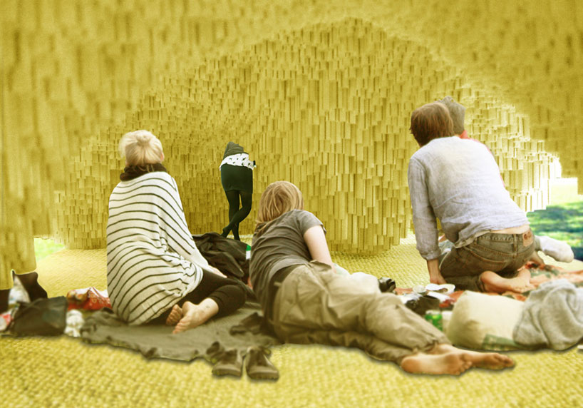 ‘Hollow’ is an organic pavilion that changes the conditions for social interaction and behavior. Simply built, using compression to hold the structure, the concept is designed by Visiondivision (Ulf Mejergren and Anders Berensson) as their competition entry for sukkah city, where designers / architects were asked to design a modern sukkah (a temporary hut created for an annual jewish harvest festival) in union square, new york city. Some of the constraints implied in the competition, for example, was that the sukkah had to have a roof made out of branches, but that they could not be in bundles. This in turn influenced visiondivision’s decision to use the construction technique of compression to build ‘hollow’. The competition asked teams to design a sukkah to be erected in one of the most populated and dense places on earth, filled with built structures and a stressful ambience, changing its function from its initial protection purpose from sandy winds and a blazing sun to a shelter from building mass, infrastructure, scale, city pace and constant movement. The swedish duo’s intention is to build something which contrasts the scale and pace of the rest of the city. When entering the sukkah, you automatically slow your pace and behaviour, switching to more restful position as a result of the physical restrictions which make up the small space.