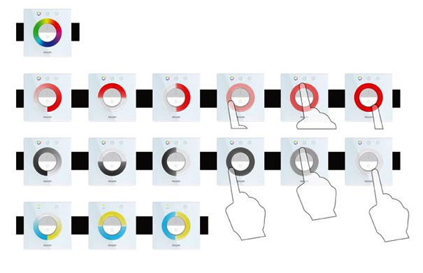 The To Be Touched Range is a series of intuitive light controllers for the LivingColors series by Philips Design. The models in this range from a simple on/off switch to one that includes a dimmer. The beauty in these switches is the visual color effect that they imbibe. The color saturation and intensity are directly proportionate to the lighting settings chosen. So a deep color ring suggests that the lights are at their brightest. It also has a proximity-detection and sleep-mode: The device wakes up, showing the color ring, when a finger approaches. If no one is within range of the device after 15 seconds the backlight is switched off and the device goes into sleep mode.