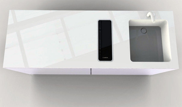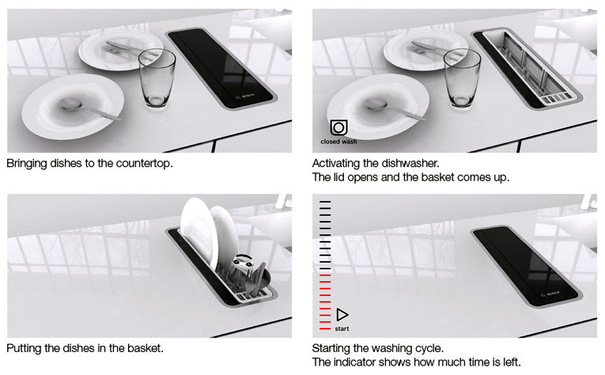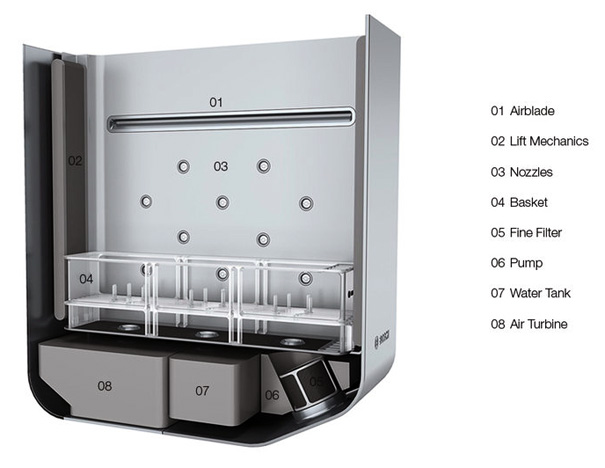 Developed with the help of Bosch, Robert Lange looks to have done his homework well. This is what he has to say, “The dishwasher has a basket that goes up and down a shaft, where all the nozzles are located. All the other hardware like the pump, the air turbine, the flow heater, and the water tank are in the bottom of the device.”