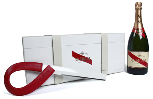 This year once again, the House of G.H. Mumm presents a limited edition work: the Sabre G.H. Mumm by Patrick Jouin. Patrick Jouin wrapped a stainless steel champagne sword with a beautiful red leather handle resembling Mumm’s signature Cordon Rouge. I was particularly intrigued by this because champagne swords are among the short list of items I am never allowed to play with… ever. But it’s a unique item that combines the sensuality of a red leather handle with the resistance of a steel blade but with a square end that won’t cut. This edition is presented in a box of pure white, of lacquered wood and leather, incorporating a tray, specially designed to hold ice and keep a bottle of Cordon Rouge at the ideal temperature.
