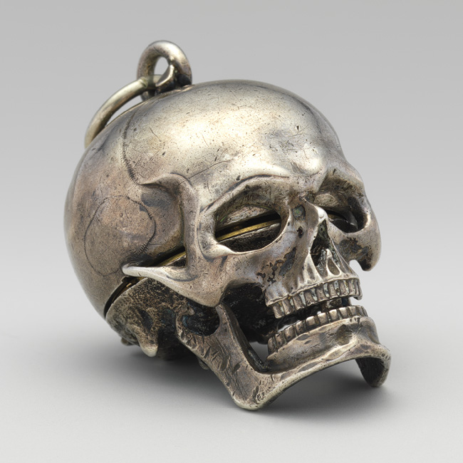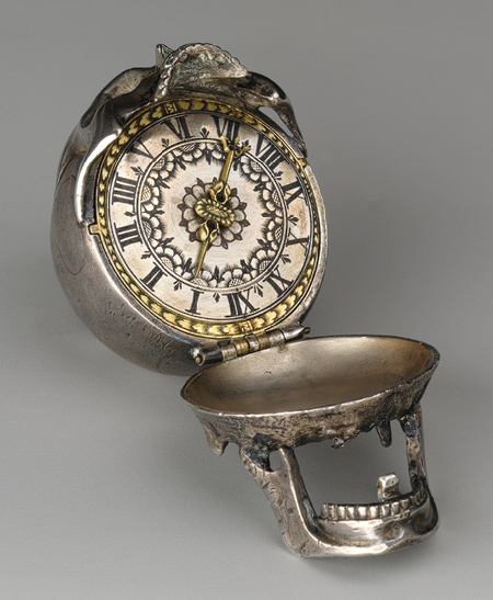 I’ve been hearing that at first people were getting sick of me talking about how much I enjoy collecting time pieces, then I was told that some people had no idea that some of the watches I’ve written about existed. So in the interest of informing the public about one of the rares time telling devices I’ve come across, I present a this piece from Isaac Penard. The lower jaw is hinged to the base of the skull to make a cover for the dial of the watch. The dial is engraved and filled with niello marking the hours with Roman numerals (I–XII) and the half hours with fleurs-de-lis. The skull watch was a specialty of Geneva, and to a lesser extent of Blois, both prominent centers of Protestant watchmakers during the first decades of the seventeenth century. Isaac Penard was a native Swiss who was apprenticed to the Genevan master Jacques Sermand (1595–1651), a well-known maker of skull watches as well as watches in such shapes as tulip buds, crosses, and stars.
