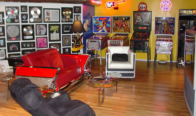 Dan Leap is a regionally loved guitarist in Midwest rock band Pompous Jack and founder of GuitarLamp.com. The perfect showcase for his two passions (music and DIY design) is his cool ’80s-inspired loft, located in his Merriam, Kansas, home. Inside, lamps, tables and headboards are all made of custom guitars, while pinball machines, retro couches and framed records decorate the space. This is one spot however that doesn’t bring anyone directly to mind.