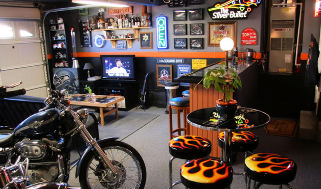 Tony Munshi loves his motorcycle-themed garage in his Santa Clarita, California, home. Two years in the making, the “cave” comes complete with indoor/outdoor carpeting, an oak-laminate bar top stained in ebony and covered with a glass slab, exhaust flame–themed stool covers, a glass-door refrigerator, 46″ TV and, of course, the three Harley-Davidsons he shares with his wife, Kathy. I know my assistant is wondering why I didn’t say this one reminds me of her, but this one’s got Tasha T. written all over it.