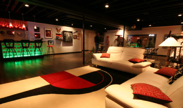 This one is the mancave I see as my own. After seven months of framing and painting, Michigan-based water utility control systems developer Glenn Maggard completed his fantasy basement. Looking for a space to both entertain friends and dance, he and his wife, a scientist, wanted a modern look and feel, which they achieved with a flat black–painted ceiling, ebony laminate flooring, a glass block bar with granite tile, a graphic wall mural, Momeni rug, mod white leather couches, neon lighting and dance poles, which are conveniently part of the basement’s infrastructure.
