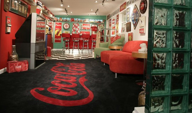 Freelance artist Ray Kilinski and his wife Dianne have been collecting vintage (pre-1960) Coke memorabilia since the early ’70s, and is an active member of the Coca-Cola Collectors Club. In his malt shop–style room is a black-and-white checkered floor with a large Coca-Cola logo rug, a green glass wall partition and shelving reminiscent of old bottles, a vintage soda fountain, a functioning Coca-Cola Vendo 44—a vending machine made in the 1950s that holds 44 bottles—and much (much) more. I do however draw a blank when it comes to my friends that would love his place.