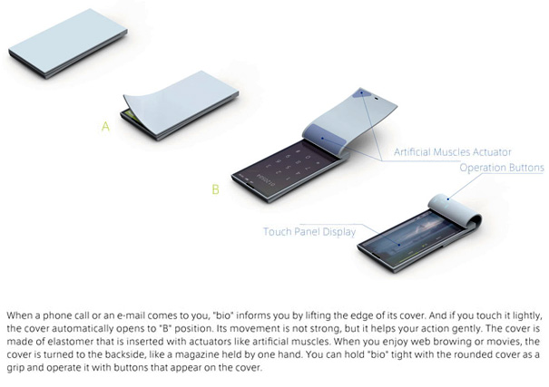 Here’s a flip phone that could put the “cool” back into clamshells. When you receive an incoming call, the corner dog-ears up and if need be, opens up (book-style) using actuators like artificial muscles in its elastomeric cover. Awesome, Motorola StarTAC 2.o maybe? Who knows, but whats for sure is that just imagining someone opening this phone up on the subway would definitely turn heads. The only major concern I would have is that when the phone is my pocket, and the corner leafed out, would that make it easy to open the phone by accident and possibly pick up an unwanted call? Or if the phone was compacted in your pocket by something pressing against it (say a stripper sitting on your lap), would it break the phone if the edge tried to lift up? But with those minor concerns aside, the Bio Phone concept is one of the freshest I’ve seen in quite some time, and if any company picks it up and puts it into production, I’d for sure be one of the first in line to grab it.