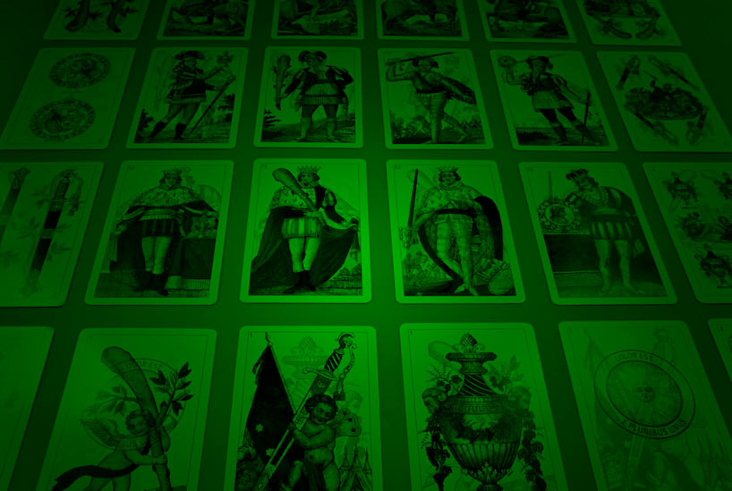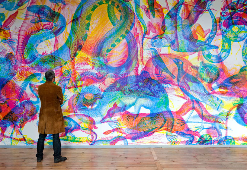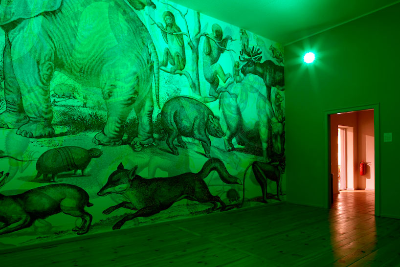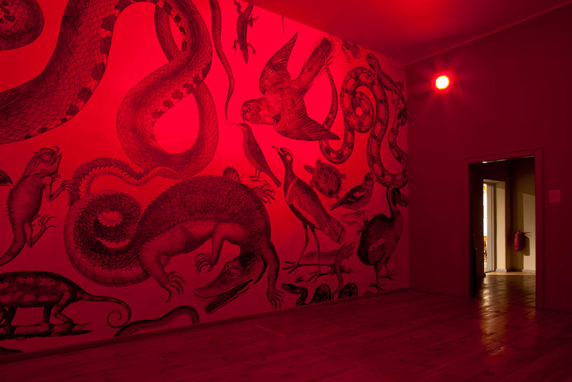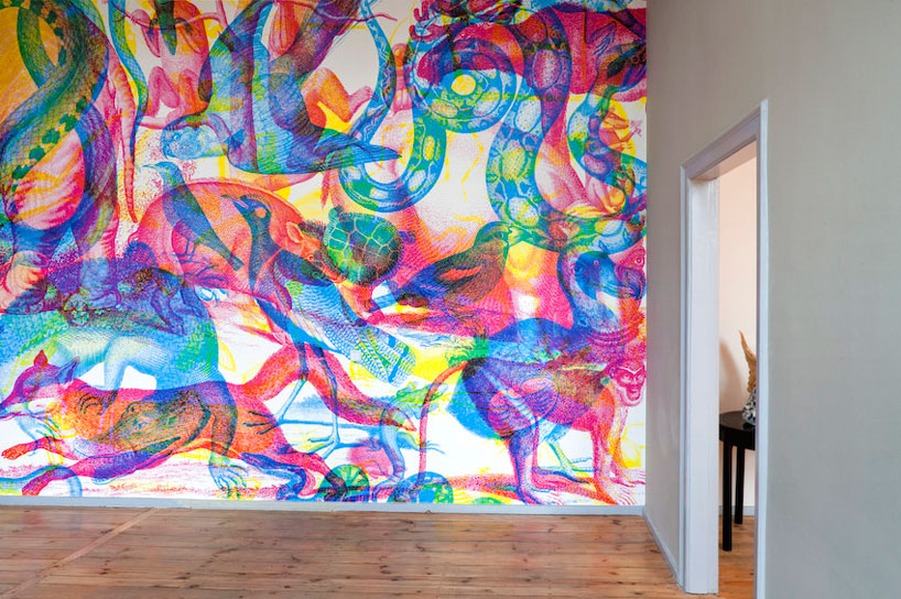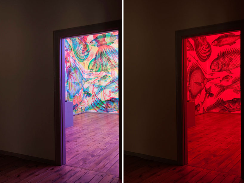 Milan-based collective Carnovsky Francesco Rugi and Silvia Quintanilla presents ‘RGB’, an exhibition which showcases a series of wallpapers that mutate and interact with different chromatic stimulus. The wall coverings consist of three different patterns (in red, yellow and blue respectively) that when overlapped, result in a disorientation of images. When colors and patterns mix up, the lines and shapes entwine becoming oneiric and not completely clear. Through a filter (a colored light or transparent material) it is possible to see clearly the layers in which the image is composed. Each one of the red, green and blue (RGB) filters serve to reveal just one of the three patterns, hiding the other two. Its super sick both in concept and in display.