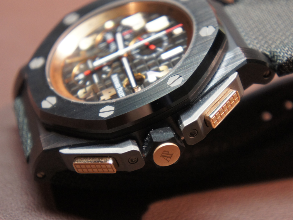 The contrast between black and anthracite is further enhanced by the use of beadblasted titanium, chosen for the screws that punctuate the octagonal bezel, the pushpiece-guards, the two applied inserts on the left side of the case, accentuating its sporting appearance. To add the perfect finishing touch to the range of materials, the applied numerals, as well as the hour-markers are crafted in pink gold. The gold of the pushpieces is adorned with a non-slip gridwork motif echoing the geometrical “Tapisserie” pattern that is a signature feature of Royal Oak Offshore dials.