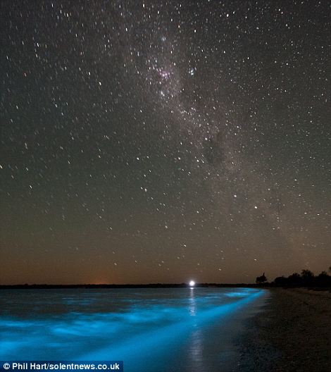 It’s believed that the combination of bushfires and floods created the high levels of nutrients in the lakes for the organisms to feed. ‘It may not happen again in my lifetime,’ said Phil. ‘I feel fortunate to have been there to see it and to have had my camera gear there to record it.’ Phil, from Melbourne, added: ‘While the luminescence was obvious to the eye, the bright blue colour is only apparent in photos.’ When the first photo that was taken appeared on screen I could hardly believe how freakish the whole thing looked.