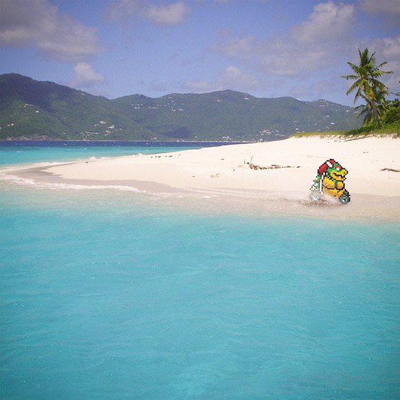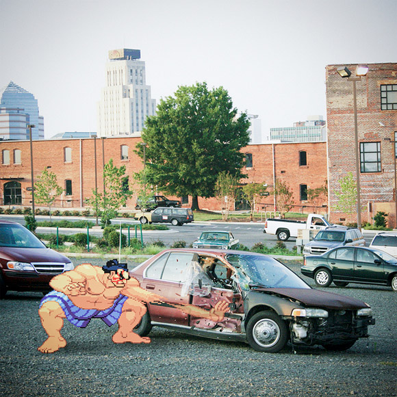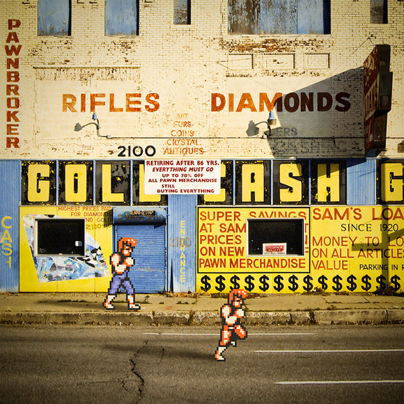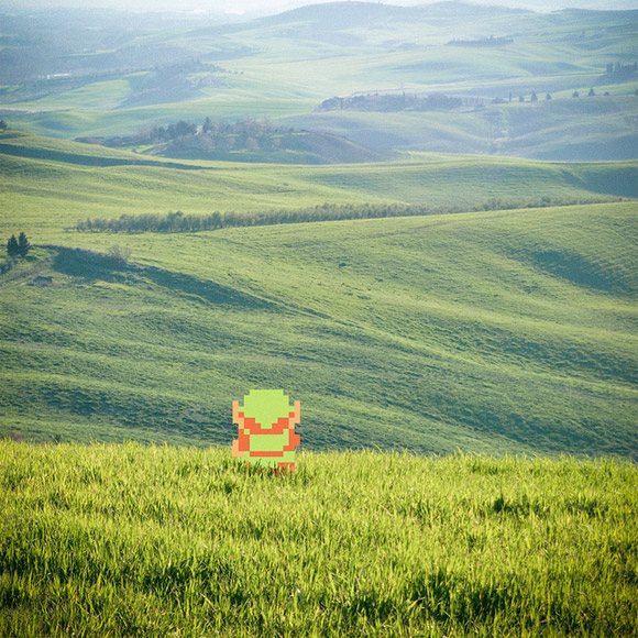 UK designer, Aled Lewis crosses the streams of reality and 8-bit with a fun new photographic series. Aled is best known for his clever t-shirt illustrations on Threadless, but his latest project superimposes your favorite pixelated video game characters of yesteryear with photographs of real life scenarios.
