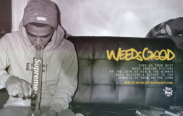 My boys with FreedMinds are giving away free tickets the Oddfuture OFWGKTA concert. As anyone who’s a fan of Oddfuture knows Oddfuture is a fan of Mary Jane. So if you excited to go to the show, submit your best weed smoking picture to info@freedminds.com, and the best picture will win free tickets to the show. Good luck, always pass to the left.