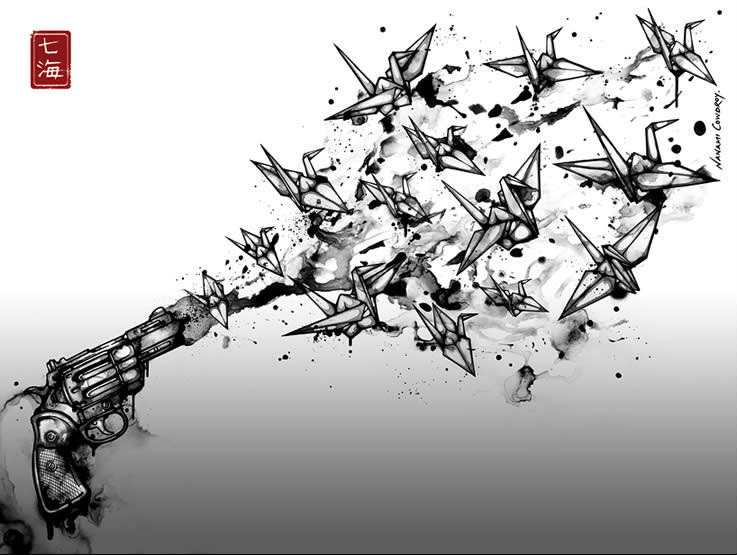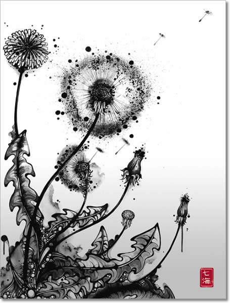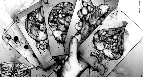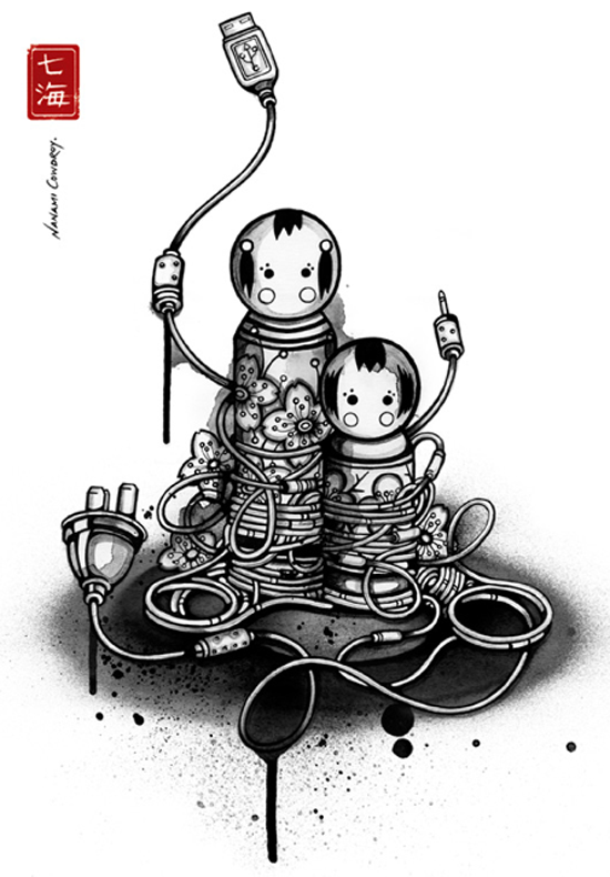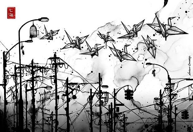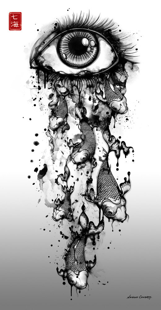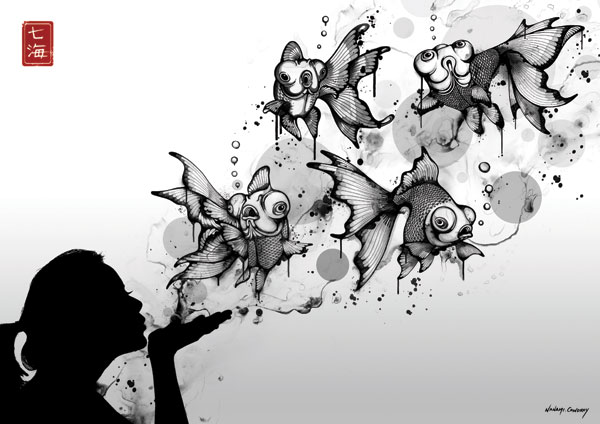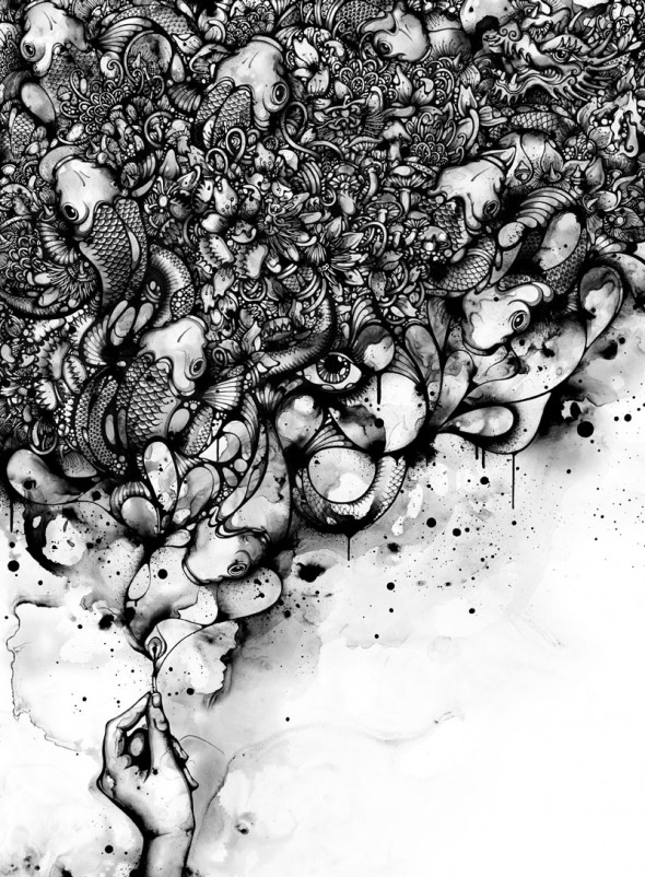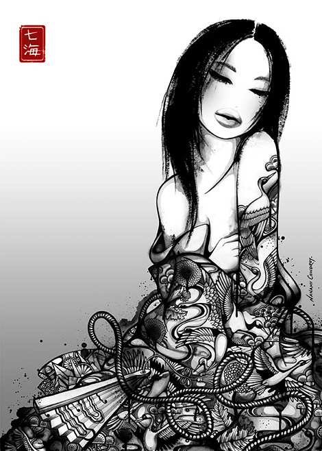 Nanami Cowdroy was born in Sydney, Australia with close bonds to her mixed Japanese-European heritage. Growing up with such contrasting cultures and surroundings, has greatly influenced her style of art and creative expression. By intertwining complex characters and highly detailed objects her pieces reflect a juxtaposition between foreign and familiar entities and environments. Her imagination is illustrated through works which are elaborate and exotic. She is drawn to subjects, which may on the surface seem delicate or fragile, but are given strength and depth through her pen and ink techniques, intricate hand illustrative style and mixed media compositions. Her signature detailed style reflects a refined monochrome pallette with her name ‘Nanami’ (meaning ‘Seven Seas’ in Japanese ) stamped in red. Fluid line-work, watery creatures and Goldfish are some of her favourite subjects, and distinctive forms which are featured in her artworks.