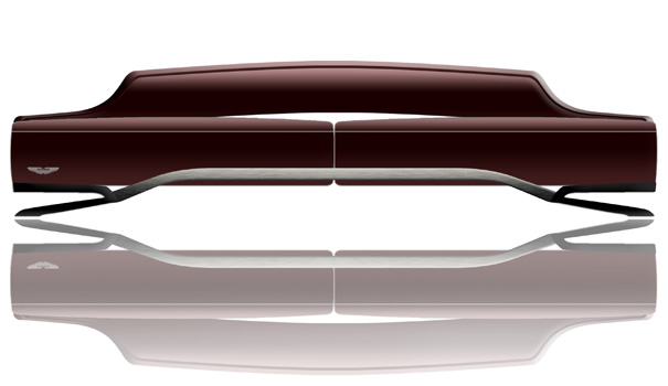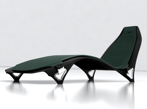 The sofa carries minimalistic lines inspired by the form and curves distinguished by the beloved car. The inside frame is made of steel and wood finished off in supple leather. 240 x 200 x 80 cm. The chaise lounge is elegant and contemporary. The monocoque bodywork is made of carbon fiber with brilliant aluminum applications. The padding is fixed to the body with elastic belts covered in leather. 205 x 71 x 87 cm.