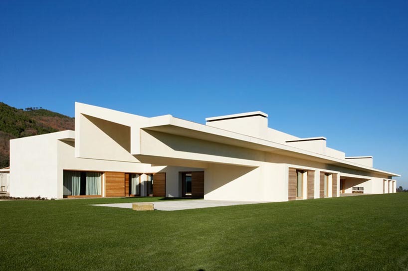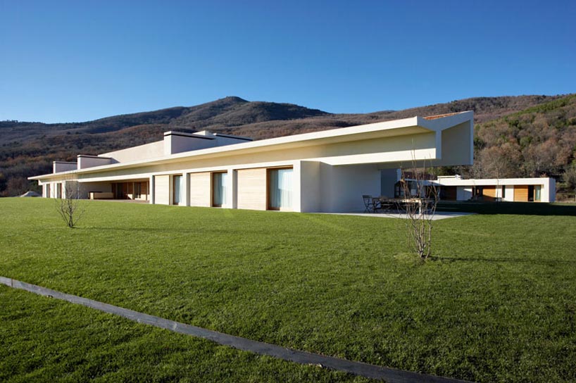 Spanish architectural firm A -Cero designed a dwelling of generous proportions, developed over a single storey to facilitate the indoor-outdoor connection. Surrounded by meadows, tree groves, chestnut, pine and oak trees and wildlife represented by stags, wild boar and roe deer, the edifice establishes a recognised link with the traditional architecture and vernacular customs. Stone, tile, wood have been used in its construction. The sense of the architecture is to formalise the space and layout of the rooms besides representing a clear tribute to rural villages. the consequence is an open, u-shaped dwelling with a large central courtyard that shares out the uses. the principal wing houses the living rooms, dining room, tv room and children’s and playrooms. In the east wing is the kitchen, laundry room and cellar and in the west wing the master bedroom. Semi-independent pavilions house the installations, riding facilities, stables and the guardians’ dwelling. Two immense awnings frame the landscape. Through an apt play of symmetries visual perspectives are created. A painstaking study of the light allows it to come in through courtyards, grooves, windows, skylights and façade openings. The courtyards help minimise the conditions of the extreme climate, provide colour, freshness and hold the ponds that reflect the serenity and musicality of the water.