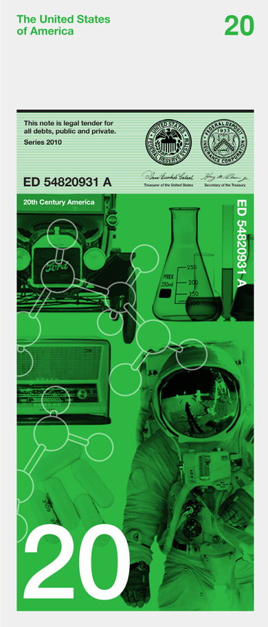 “We wanted a concept behind the imagery so that the image directly relates to the value of each note. We also wanted the notes to be educational, not only for those living in america but visitors as well. Each note uses a black and white image depicting a particular aspect of american history and culture. They are then overprinted with informational graphics or a pattern relating to that particular image.”