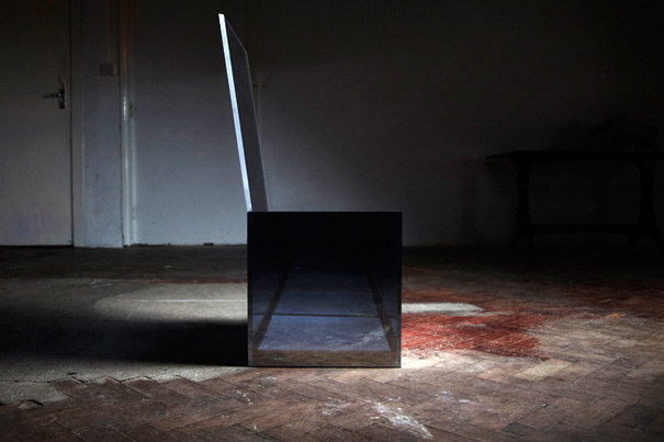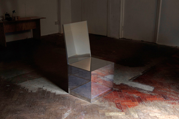 Plastic acrylic sheet and one-way mirror film are used to create a structure that reflects and merges with its surroundings. The chair not only responds to and camouflages itself to match its environment, it also interacts directly with the sitter: sensors activate pulsing LEDs hidden within its frame that quicken like a heart beat as it is approached. The effect is eerie: as the chair is lit from within, its reflective surfaces becomes transparent and all its edges are illuminated. The chair’s disappearance is an attempt at escape; yet this strangely animate object remains rooted to the spot, it’s vanishing body revealing a further hidden space within.