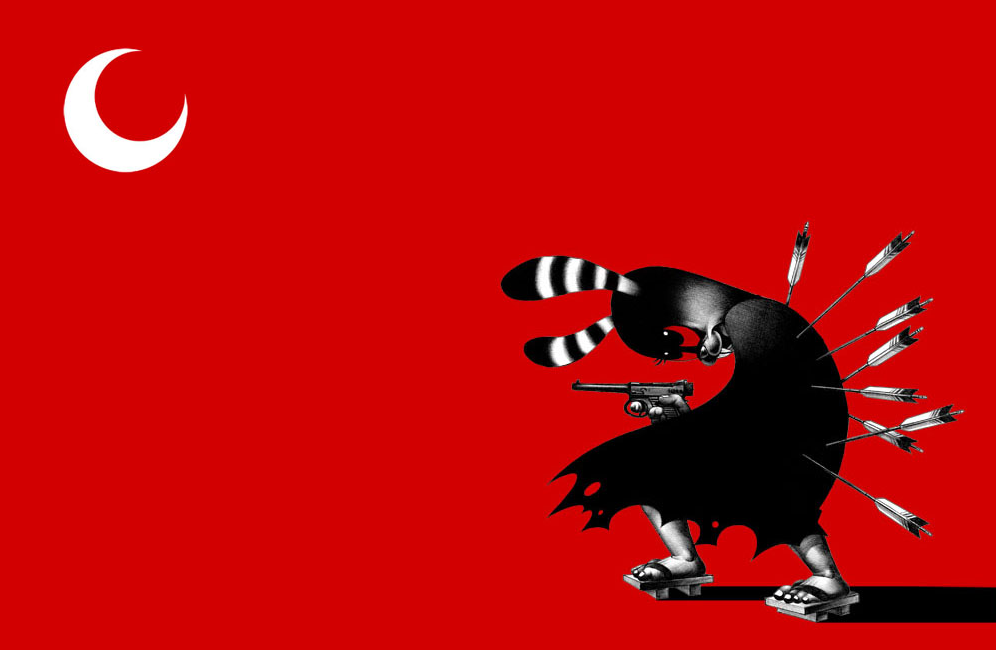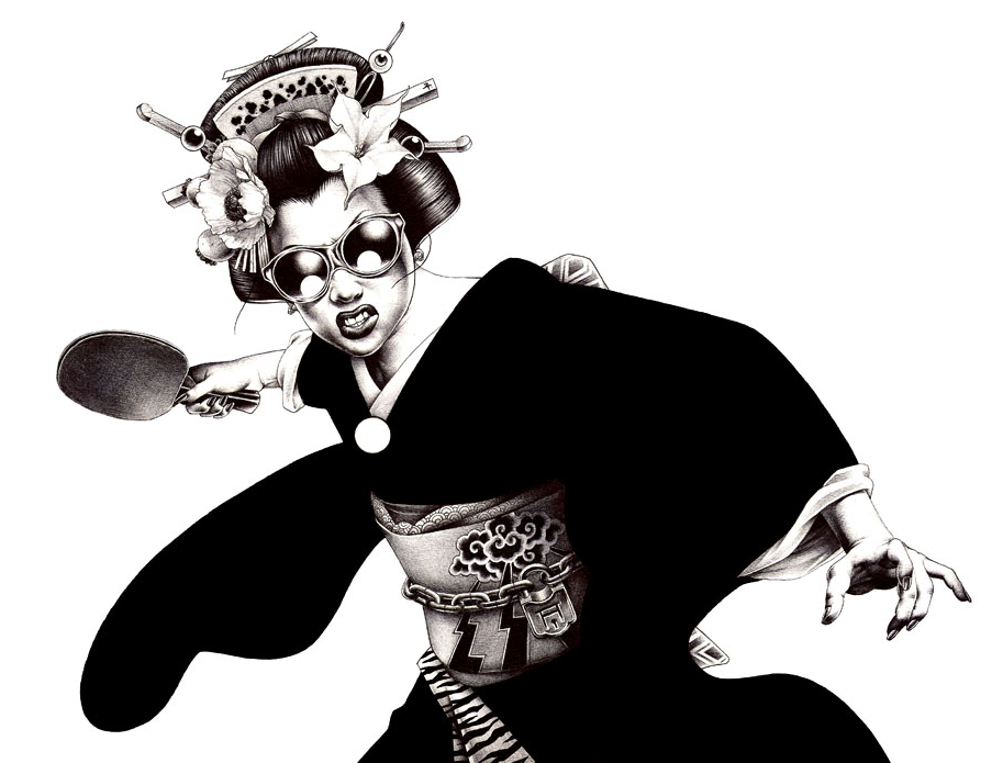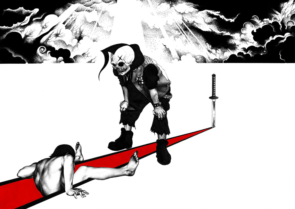 What it takes to be a good visual artist nowadays? Is it knowing how to draw hyperrealistic? Is it knowing how to use every image software that exists? I think it isn’t any of those virtues. Maybe the most important thing is to create your very own visual aesthetic, when I mean aesthetic I’m not saying style, that’s not the same thing on my point of view. You can have a really particular aesthetic Influenced by many styles, but that doesn’t mean it’s not unique. Hakuchi is one of these illustrators that really got me, not because of his detailed trace, but because of his aesthetic. 3 colors illustrations, violent / ironic content, deep inspired in japanese and manga culture. That’s how I would describe the amazing work of this illustrator (one of which is a picture of a a man riding a motorcycle penis). Enjoy.