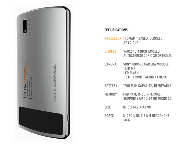 The HTC New Eden 1 Concept is 1 of 2 designs to come out of the New Eden project, hosted by BriefMobile, that sets out to create the most appealing, feasible, hardware design for mobile devices. It aims to captivate with innovative and attractive hardware, as HTC did with the original Touch Diamond and other products that followed. The New Eden 1 is a device with a durable aluminum shell that combines traditional HTC design language with a fresher, more futuristic look.