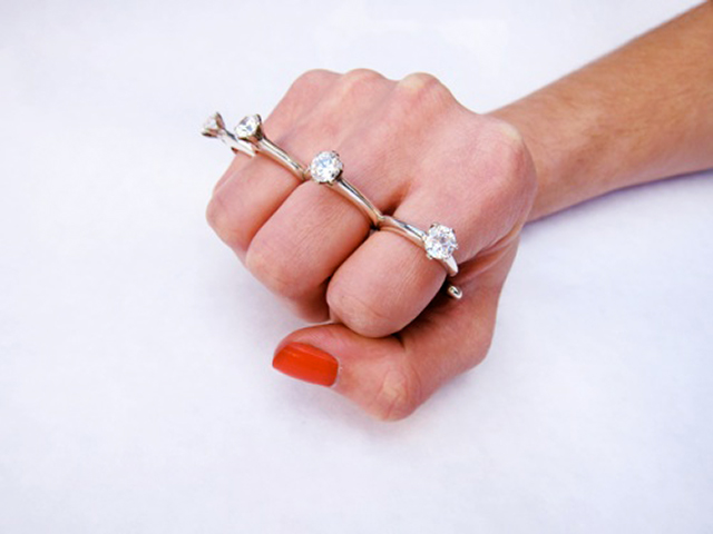 Recently one of my friends brought to my attention the work of Kate Bauman, and the beautiful piece featured above and below. Entitled “‘Til Death Do Us Part”, it takes the coveted symbol of the wedding ring and turns it into a symbol of violence. No one is saying that commitment is wrong; that would be ridiculous. But all too often I’ve seen people do stupid things for the worst reasons and those vows end up biting them in the ass eventually. Perhaps Kate meant “‘Til Death Do Us Part” as a symbol of warning of two things: take your time, and choose wisely.
