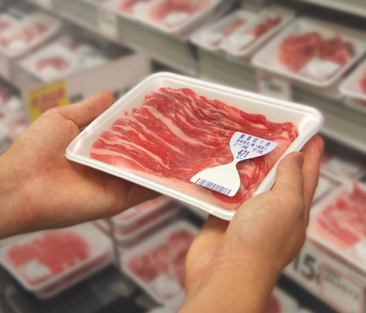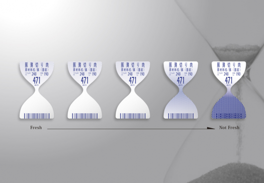 Japanese design agency TO-GENKYO has designed an innovative hourglass shaped label for packaged meat which uses a special ink that changes color as ammonia is released inside the package. As the meat ages, it releases increasing amounts of the substance, obscuring the barcode at the bottom. Customers can quickly see if the meat is going bad – and when the barcode becomes completely covered, it can’t be scanned.