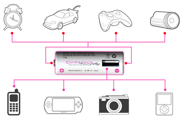 This is so simple. Continuance is a set of batteries with a USB interface on the side. The batteries are rechargeable plus dole out some juice to stranded gadgets that are starved of power. Handy, compact and a totally do-able concept. Kudos.