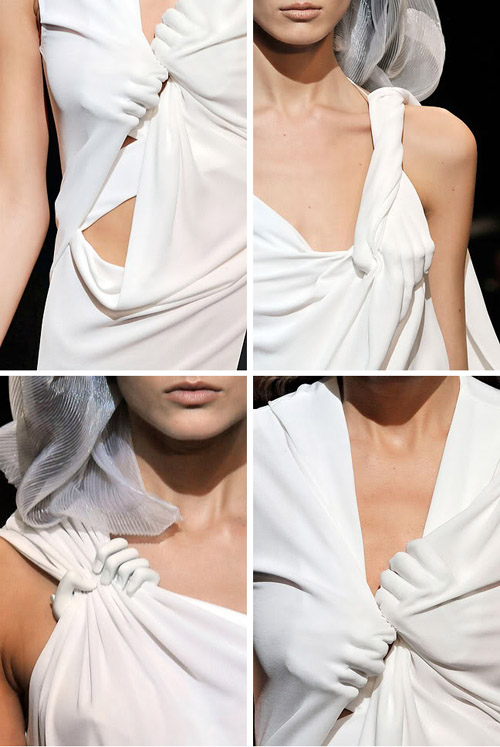 I tend to be a black t-shirt and sweats kinda guy when I’m not at work, so I’m not much of a fashion guru, and when it comes to women’s fashion, I’m even less savvy, (I prefer them without clothes, but that’s just me.) But when I got a look at a collection by Maryam Nassir Zadeh, I was thoroughly impressed. The white porcelain hands create an immensely unique look that turns each piece from just a dress, to a work of art. White porcelain hand details from Hussein Chalayan S/S 2010 via Skelerope, on sale with Maryam Nassir Zadeh.