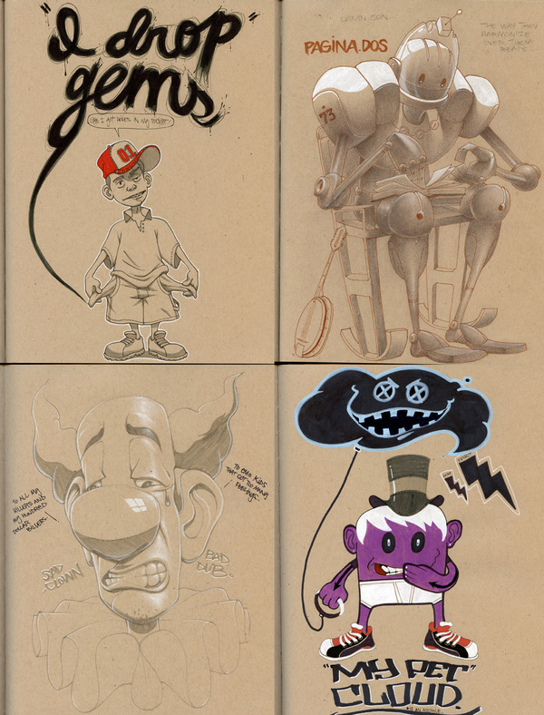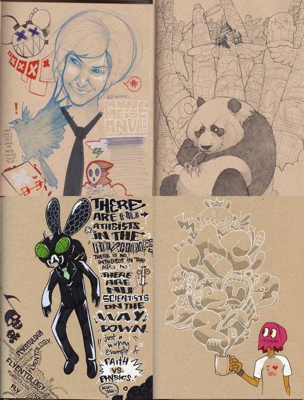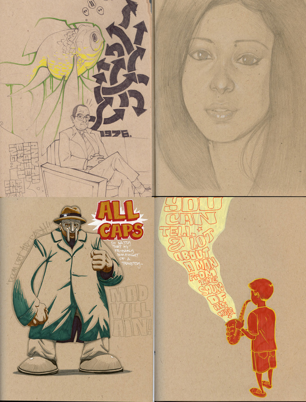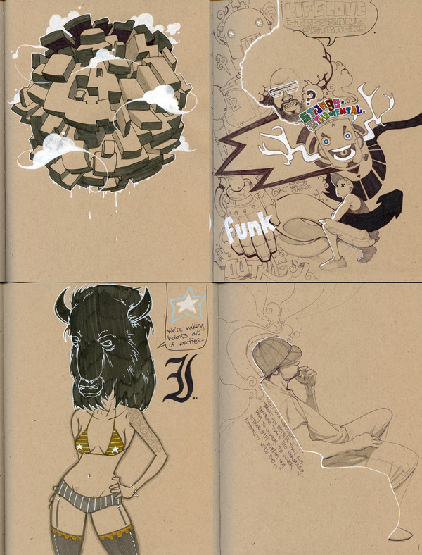 Having gone to art school, I’m no newbie when it comes to sketchbooks, and the wonders people have hidden inside of them. I’ve seen people in classes that draw and paint the most eloquent classical drawings, (like the Mona Lisa) and come home and have a sketchbook with the most rawkus, insane graffiti imaginable. A sketchbook is like a diary in the sense that it’s what’s all from what’s in your head, and the head of the artist I only know as ‘Pacman23’ is pretty dope. When he scanned in a series of pictures from a sketchbook of his, I knew I had to throw it up.