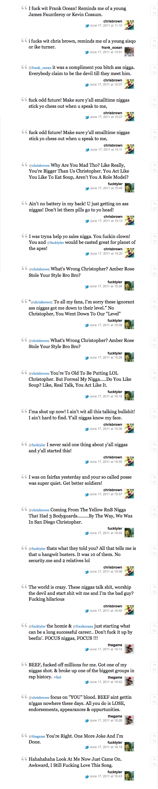 I do my best not to help stimulate hip hop beef, or draw too much attention to it on the blog… BUT this one was a little too much for me to ignore. Odd Future’s own Frank Ocean went off on Chris brown for seemingly no reason recently on twitter after Chris Brown complimented him. What ensued was a back and forth between Brown, Tyler The Creator, and Frank Ocean that was eventually broken up by none other than The Game (random.) But although the argument may have ended there, I’m getting the feeling things are just heating up. More below.