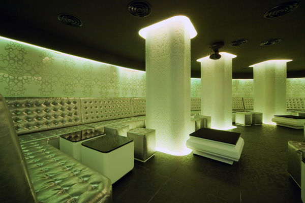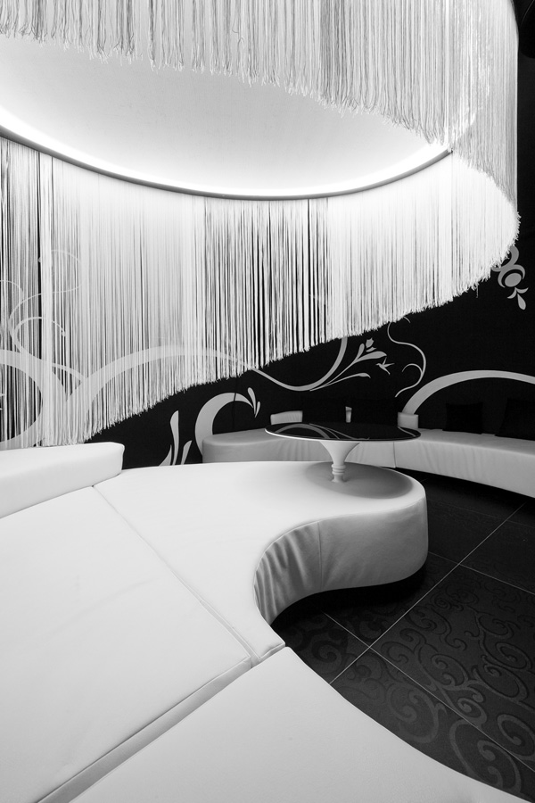 The third and smallest space is quite isolated from the rest, and features handmade graphic designs on the walls and a single lounge. Hovering above the lounge is a ellipsoidal light membrane on the ceiling made of a elastic membrane that diffuses the light. To polish the look the designers used white fringe to better illustrate the shape and link the two elements.