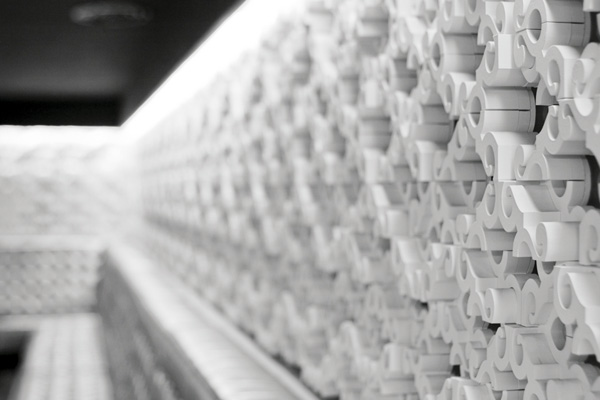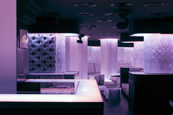 At the start of the remodel, the design team noticed 7 to 8 layers of material applied to the walls, giving them a peek into the location’s history, and sparking their interest in its mysterious past. The first of the 3 defined spaces within the club is also the largest and features a high density of structural pillars. By covering the pillars in mirrors and applying three-quarter lamps across two edges on each, the columns seem to disappear and a “forest of lamps” emerge. The volumetric pattern on the surrounding walls is CNC dense polyurethane foam painted white. Behind the pattern are mirrors that continue the visual effect of the mirrored pillars.