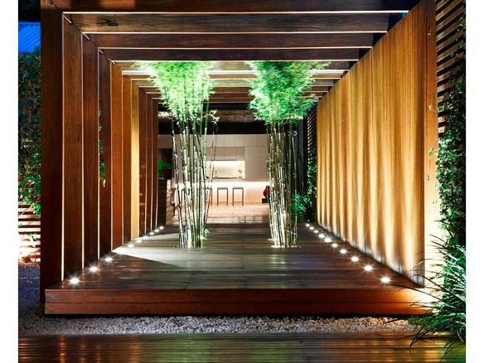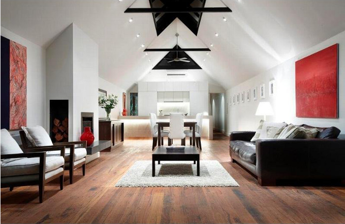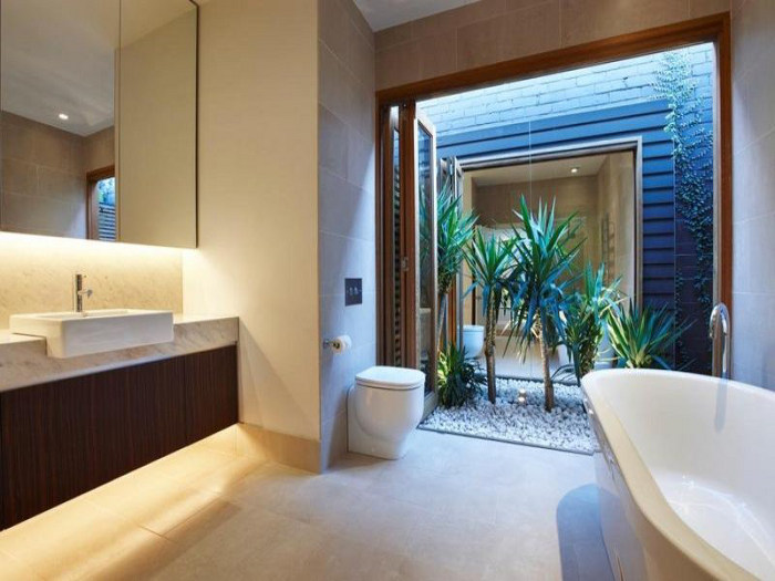 Doctor Who fans will probably know the secret of the tardis. Bigger on the inside than it appears on the out. Who could imagine such high open spaces could be lurking behind this narrow single fronted house in Port Melbourne? A clever extension lifts the space to follow the roof pitch and seamlessly melds the inside and out. Features that speak to me are the two “open” bathrooms, the way light is brought into the centre of the house through a series of pitched skylights and a clever open garden room. Lovely.