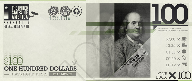 No matter what industry you work in, if you have a job, you have an appreciation for money, but for some people having it is just as good as looking at it. The visual esthetic of the $100 bill hasn’t changed too drastically in the last 20 years, but recently a collection sprouted of reinventions of the bill with Mr. Franklin’s face. There were some whimsical additions to the collection (like the one above) but I tried to focus on the cooler/more practical ones. Check the method below.