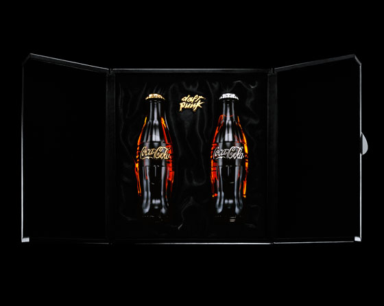 After the Daft Punk inspired Club Coke 2011 bottles launched earlier this year, here is the official Daft Punk x Coca Cola collaboration bottles. The classic Coke glass bottle comes with gold and silver Coca-Cola logo application and matching Daft Punk bottle crown sitting on top. The silver one is actually 925 silver and the gold one features 18k yellow gold. Hand finished the bottles are sitting in a box designed by Daft Punk. The signed box set is limited to only 20 sets worldwide. You can enter to win a box set, which is signed by the artists, at daftcoke.com.