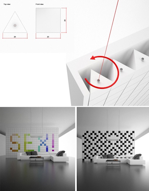 Feeling dark? Switch from colorful rainbow patterns to a pitch black surface in seconds. Want a bit of a flavorful accent? Spin the wheels again to display words or patterns of your choice. This ingenious pixel-perfect wall design renders paint redundant. Amirkhan Abdurakhmanov (better known as Amirko) has come up with this simple but dynamic wall decor idea for transforming an ordinary surface into a do-it-yourself design canvas that lets you set the tone (or tones) depending on your mood.