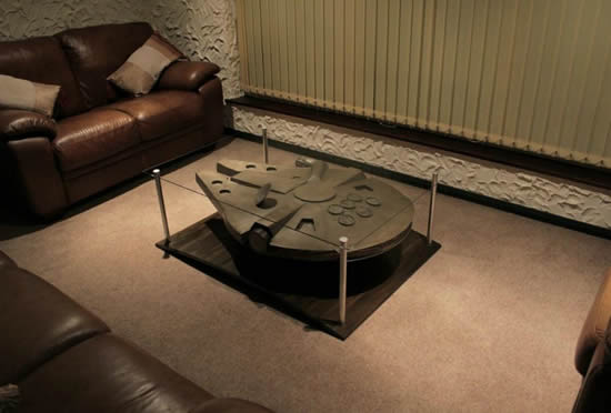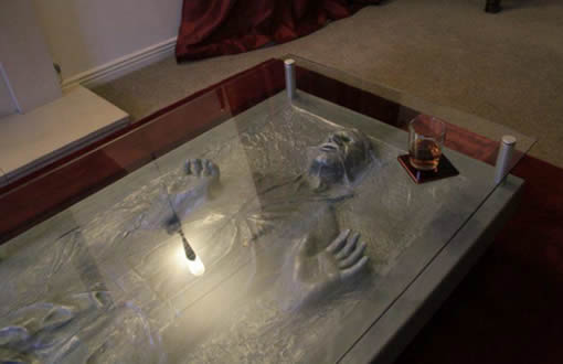 I have to say that the nerd in me for sure came out when I saw these for the first time. The Han Solo in carbonite table would be a perfect fit into my spot for a one of a kind nerded-out centerpiece. The millennium Falcon coffee table comes a close second, but is still pretty dope. Designed by UK based R9 Studios, the cold cast aluminum, machined hardware and toughened glass geeky Star Wars Tables go for about $2,050 (£1,250)