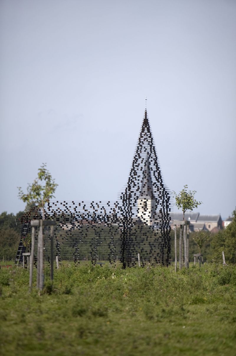 Gijs Van Vaerenbergh, a collaboration between young Belgian architects Pieterjan Gijs (Leuven, 1983) and Arnout Van Vaerenbergh (Leuven, 1983), have built a see-through church in the Belgian region of Haspengouw. The church is a part of the Z-OUT project of Z33, house for contemporary art based in Hasselt, Belgium. Z-OUT is an ambitious longterm art in public space project that will be realised on different locations in the Flemish region of Limburg over the next five years. The church is 10 meters high and is made of 100 layers and 2000 columns of steel. Depending on the perspective of the viewer, the church is either perceived as a massive building or seems to dissolve (partly or entirely) in the landscape. On the other hand, looking at the landscape from within the church, the surrounding countryside is redefined by abstract lines.