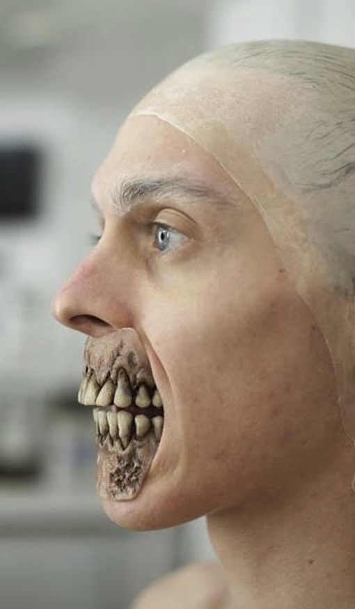 2. Next, Galbraith is fitted with rotten-looking, custom-made dentures that can fit under a prosthesis.