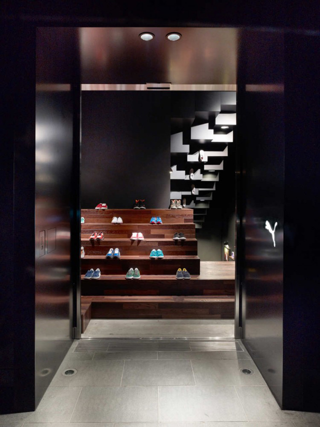 Cool, grey cement is outfitted in warm wood stairs that encircle columns and serve as a repetition of pedestals, showcasing the new sneaker line. The team at Tokyo-based, Nendo, who curated the space explains, “For our design, we placed ‘staircases’ that climb around the existing features of the space like vines. The resulting effect is a strong reminder that we exercise our bodies daily, going up and down stairs, and has a visual connection with stadium stairs and podiums, to bring in PUMA’s important relationship with sports.” Talk about stepping up their game.