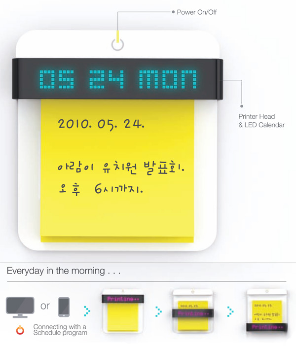 With the million things on my to-do list I need handy Post-it reminders everywhere. I even use digital Post-it notes on my phone because even with my assistant holding me down, I’m a scatterbrain. I like Dongyeon Kim’s idea of a Post-it printer with re-usable sticky notepaper. Sync it with the phone or computer and get notes printed in a jiffy.