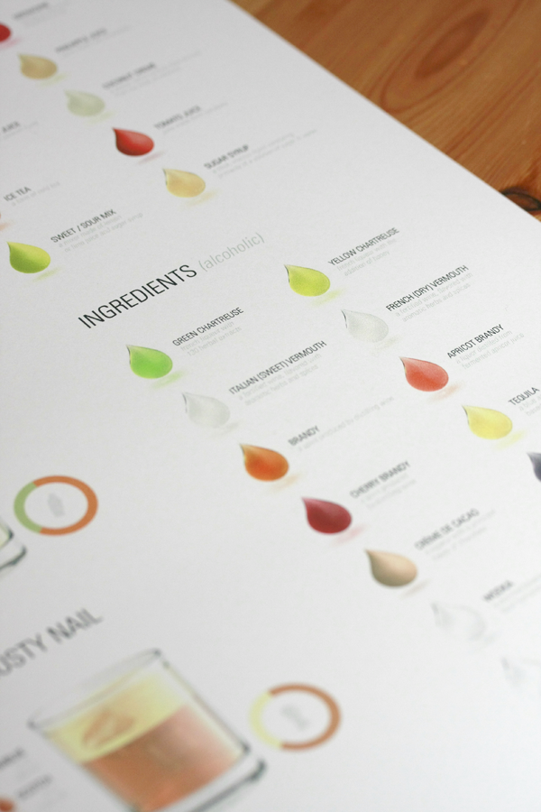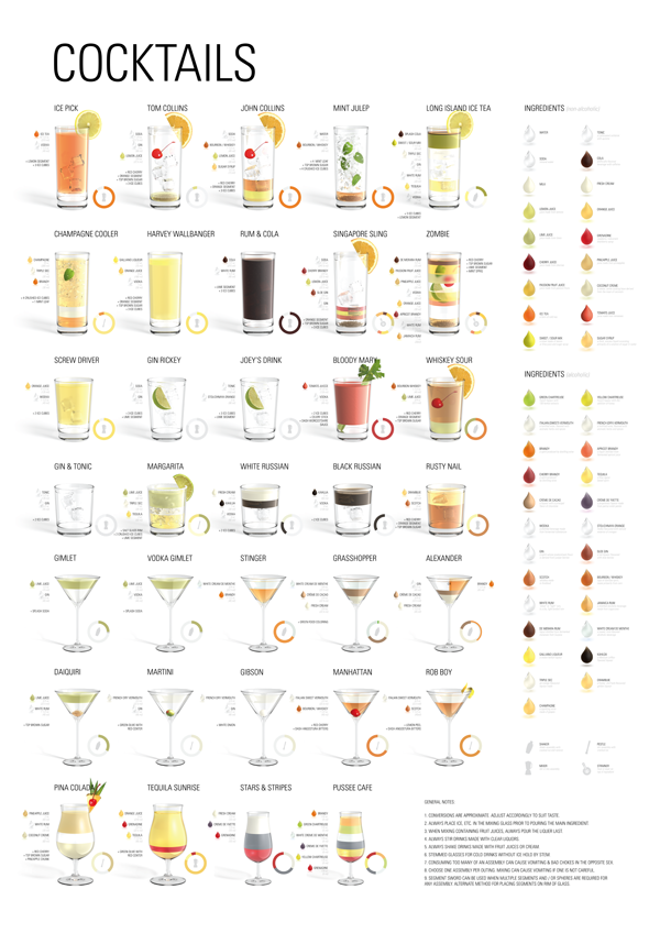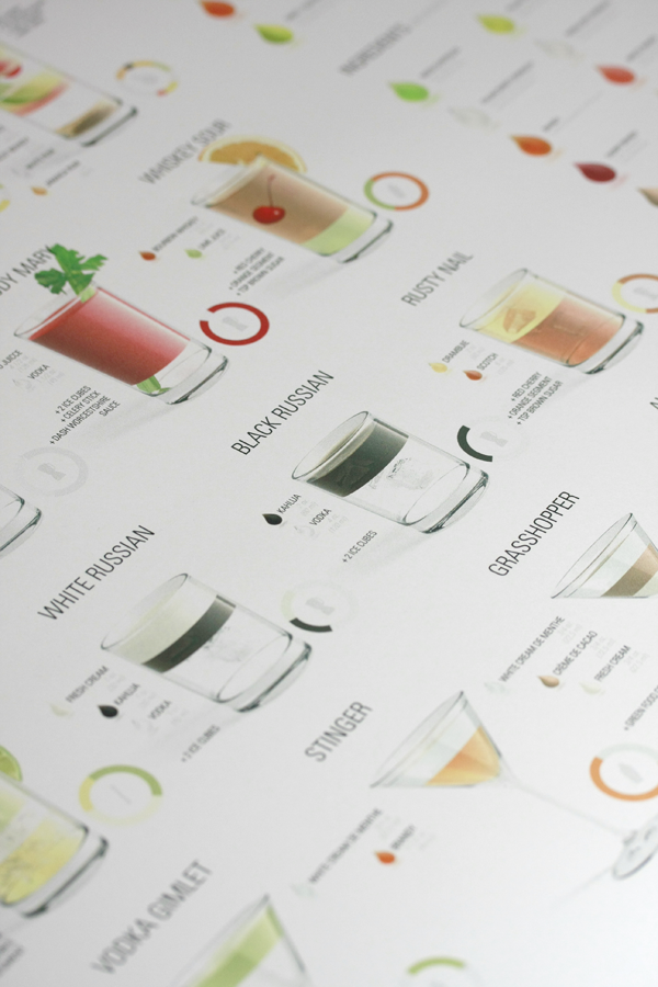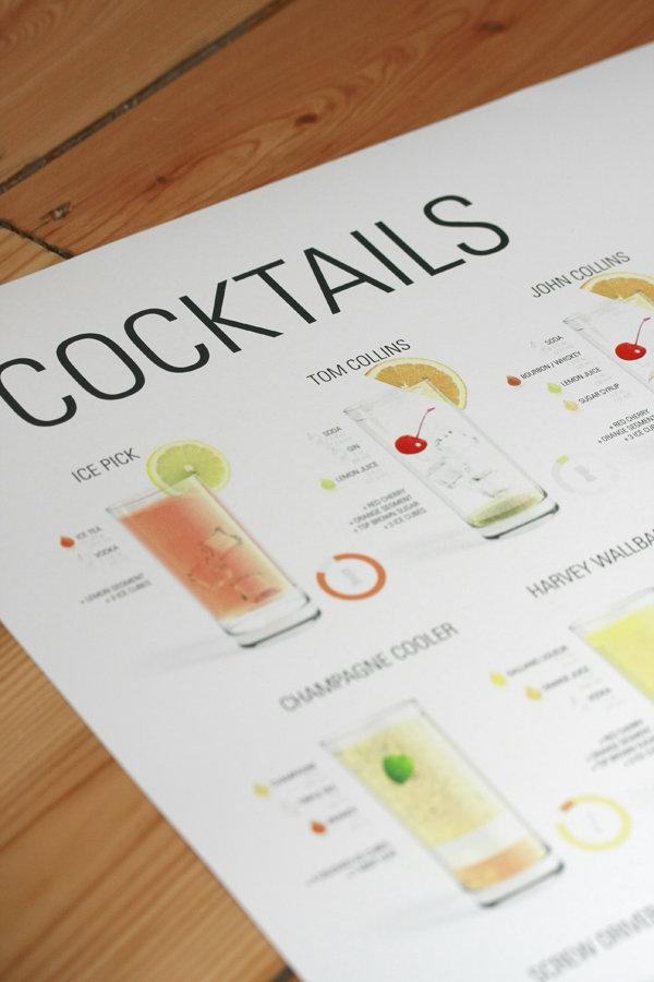 Being the alcohol connoisseur that I am, I routinely check the web for new and exciting drinks. (or Dranks as my boy keeps calling it right now). I found an amazing project made by Konstantin Datz, 22 years old and studying design on university of applied science, Potsdam (Germany). The cocktails poster is the ultimate collection of the 35 most common cocktails and shows an abridgement of the ingredients of these cocktails. If you love cocktails and if you love design, this poster is perfect for you. Based on this poster there is also an app to view the cocktails on your iPhone, be sure to check out the website for this app, it has an amazing design.