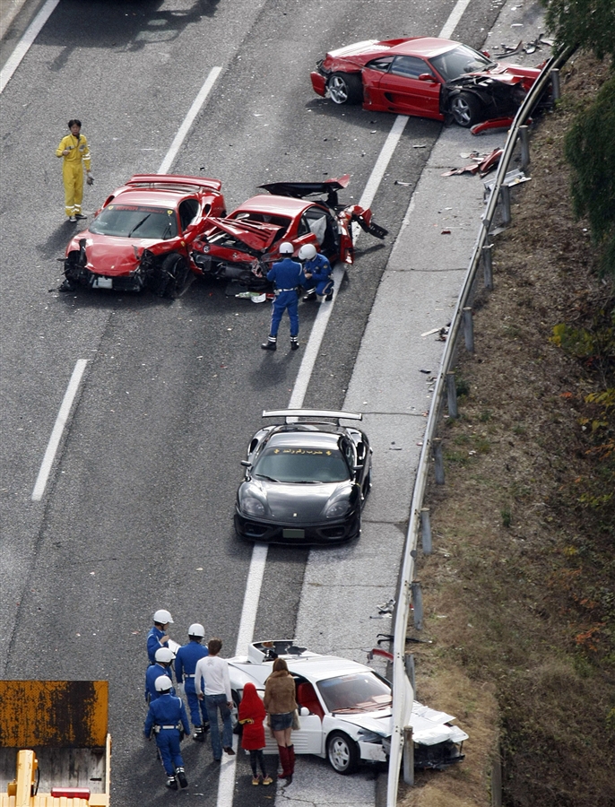 A fleet of luxury sportscars has been involved in one of the most expensive accidents in history after an astonishing multi-car pile-up in Japan. The wreck included several Ferrari 355s, Ferrari F430s, Ferrari F360, Ferrari F512, Lamborghini Diablo and three Mercedes models as well as a Nissan Skyline. The Ferrari driver reportedly lost control round a wet curve of China Road in Yamaguchi Prefecture when he hit a median creating a catastrophic chain reaction.