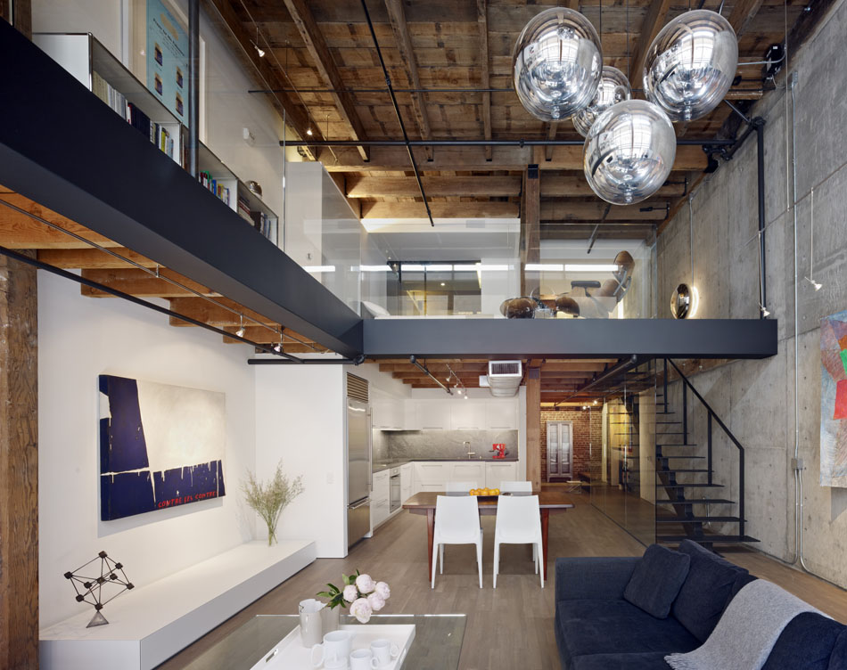 The original shell of the space was compromised of heavy timbers and rustic old bricks. The architecture team added modern and sleek new fixtures in the restroom and kitchen areas, and a new cantilevered steel staircase, which leading to the sleeping quarters. New age elements were added to the design of the space including a set of spherical reflective lights hanging over the living room, gallery style canvas art hanging from the walls, and polished oak wood floors to contrast the existing timbers.