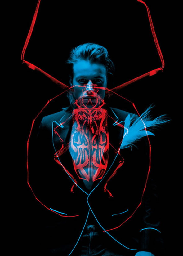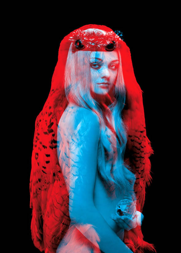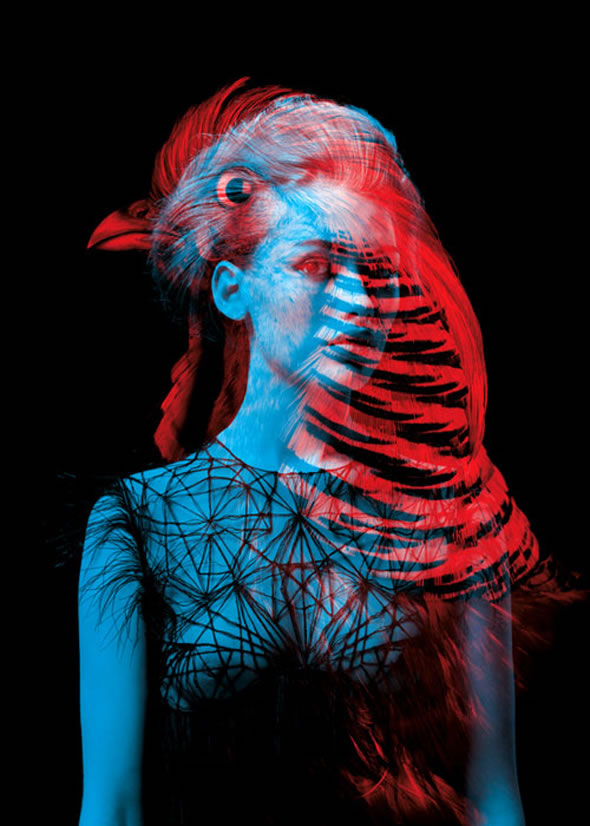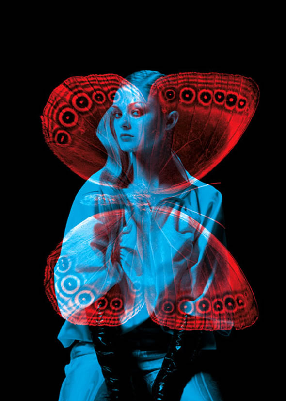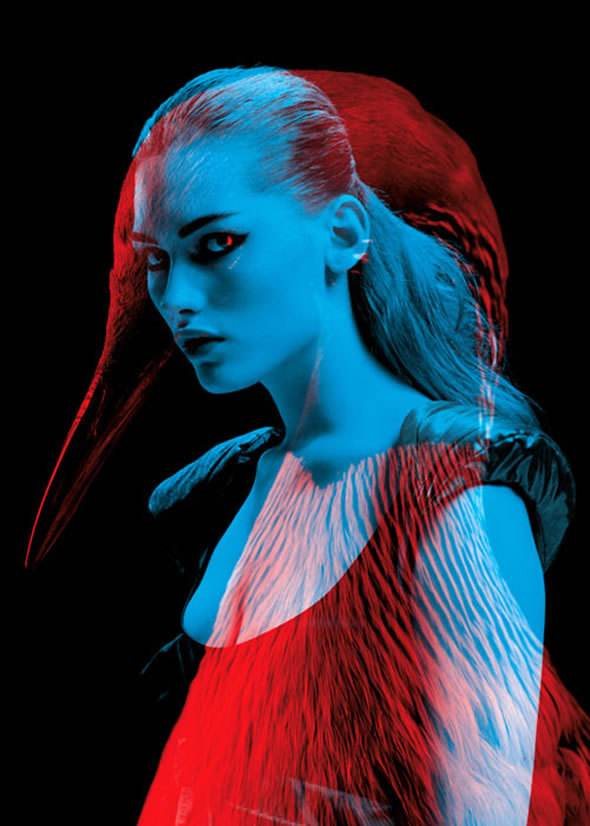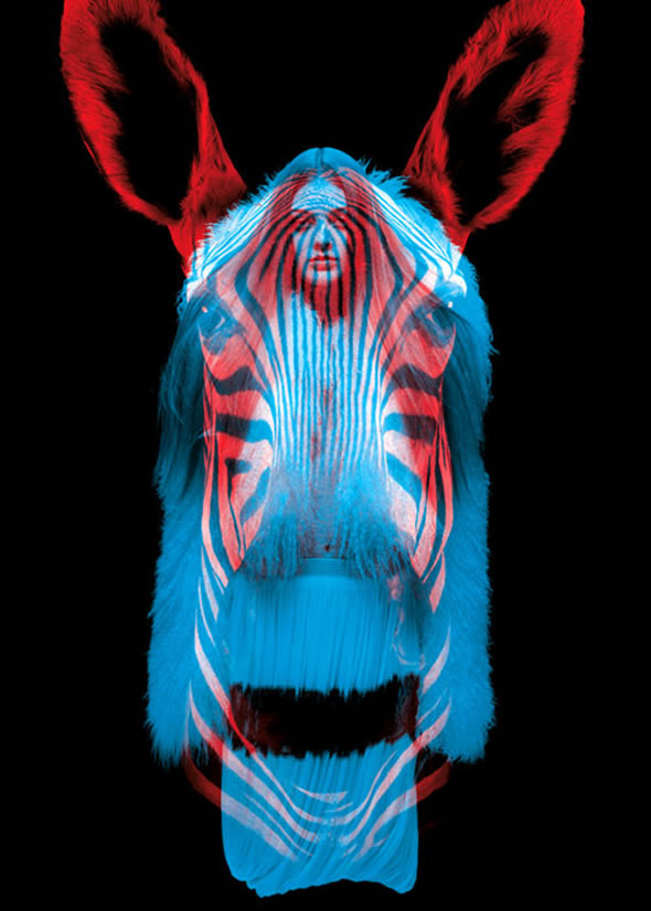 For this series titled “Bêtes de mode” (Fashion Animals) by HELMO, blue portraits and red animal portraits are superimposed then and displayed in the windows of the Lafayette Galleries on Hausmann Boulevard. A system of colored gels colored blue and red on the panes makes it possible to see the portrait mode sometimes, and sometimes the animal portrait. For this installation, the optical system of the gelatines of color was replaced by projection lights, – red and blue. The images are fairly large in scale (5×8 meters)… Check the method.