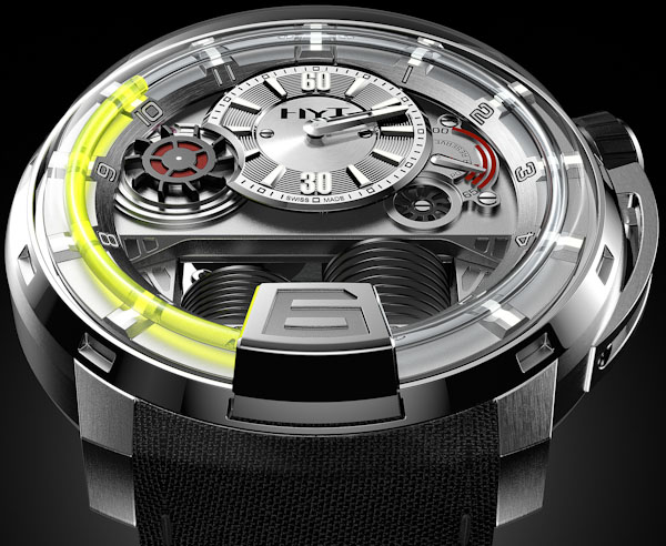 HYT represents a new concept in watchmaking — HYT stands for “Hydro Mechanical Horologists” and the brand will be dedicated to producing watches that not only contain liquid in them but use the liquid for a functional purpose. HYT claims 7 pending patents for various aspects of the H1, further underscoring the new ground that HYT CEO Vincent Perriard is breaking with this watch. Coming in three case styles the H1 will be available in titanium, DLC black coated titanium, and 18k red gold. The case will be 48mm wide and 18mm thick. Of course the most notable aspect of the watch is the luminescent greenish-yellow liquid ring you see around the dial. The H1 uses the liquid to display the hours on a circular tube around the edge of the dial.