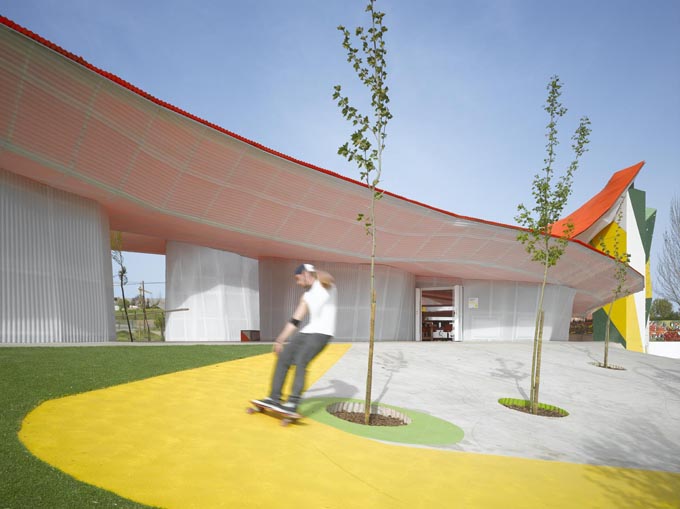 Youth Factory, Factoría Joven, in Mérida, Spain, is an example of what can be done if a regional government works with the community and local designers to meet the needs of youth that may otherwise be heading down the slippery path of street life. The structure may not be a permanent monument to architecture, but it is definitely a better place than the back streets of Spanish cities. I’m all for any attempt at all to provide children and youth a place to be kids, to be creative and just have some fun. Factoría Joven was designed by Madrid-based Selgascano Architects, a partnership between husband and wife, José Selgas and Lucía Cano.