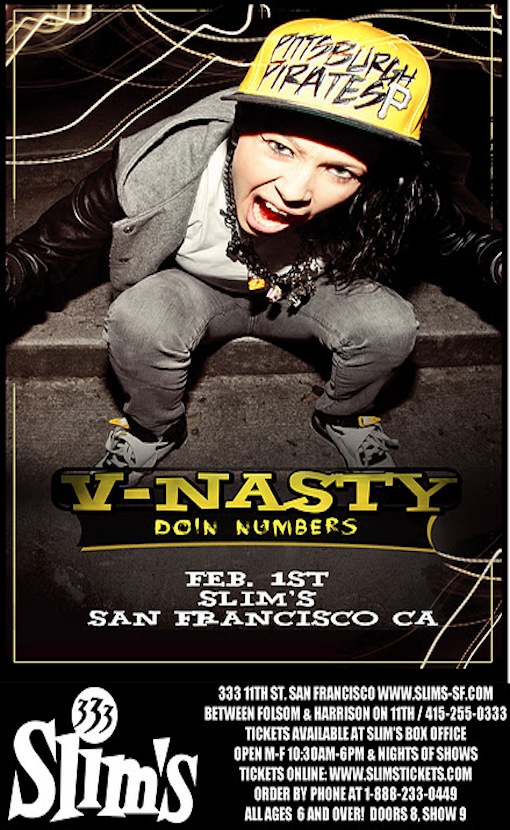 Not just Kreayshawn’s right hand woman, V-Nasty has risen in the spotlight through her own sharp rhymes and often dirty mouth. We’re interviewing the blossoming White Girl Mob member and want to know what you want to ask her.Not just Kreayshawn’s right hand woman, V-Nasty has risen in the spotlight through her own sharp rhymes and often dirty mouth. The blossoming White Girl Mob member V-Nasty performs at Slim’s in San Francisco on Wednesday, February 1. Check out the song by Gucci Mane & V-Nasty “Millions Every Month” by clicking the pic below.